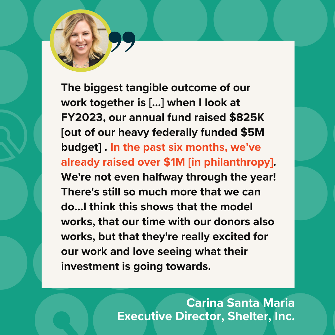 This is one of the reasons Carina Santa Maria reached out to me last year! She's an incredible leader and licensed clinical social worker who has scaled Shelter Inc.'s revenue over 3X since she took the leadership reins in 2018.